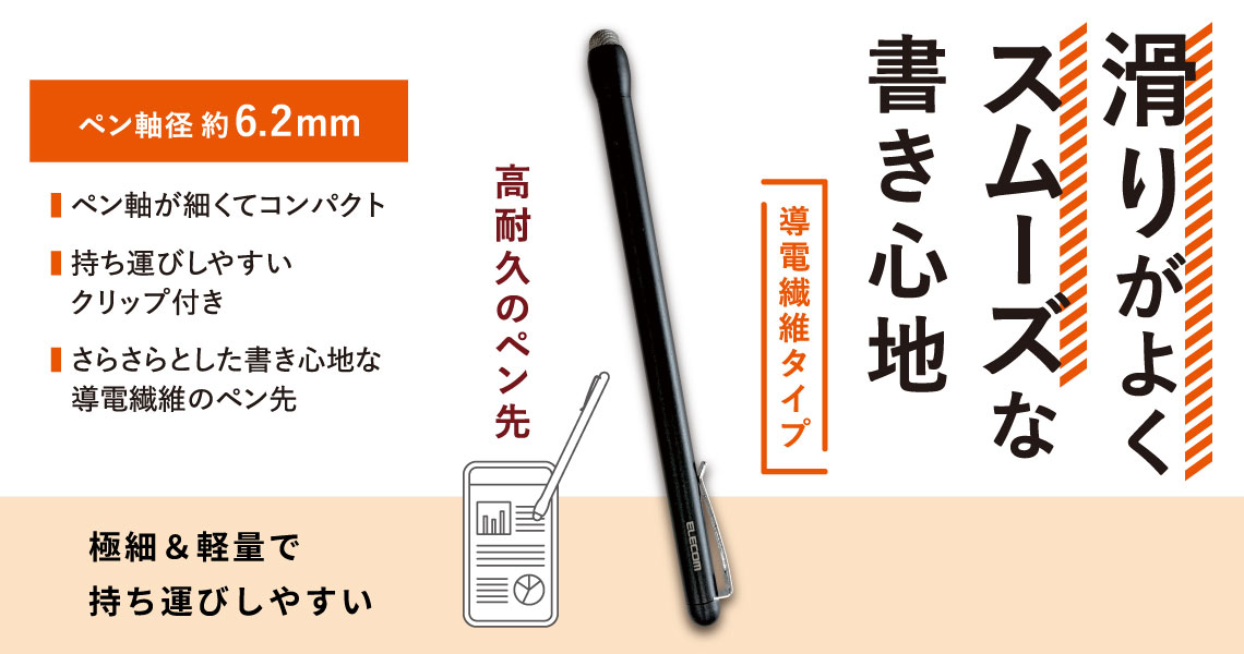 滑りがよく、スムーズな書き心地!極細・軽量でスリムに持ち運べ、サッと取り出せるタッチペンです。耐久性の高い導電繊維素材のペン先を採用しています。
