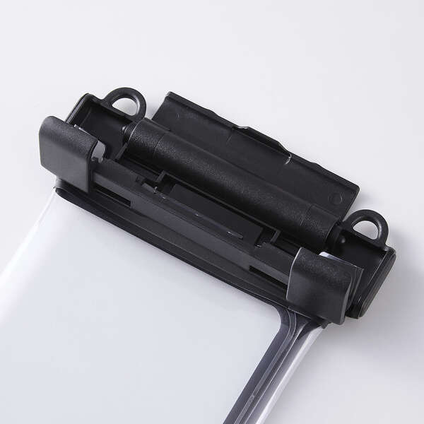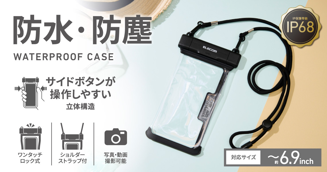 JIS保護等級IP68(JIS C 60529:2026)に準拠した防塵・防水性能を備え、しっかり閉じて、必要なときに素早く開けられるワンタッチ開閉クリップを採用。サイドボタンが押しやすい立体構造のスマートフォン用防水ケースです。