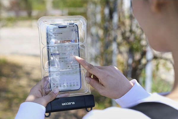スマートフォンと防水ケースの間に空気層を設ける特殊構造を採用することで、水中でのタッチ操作が可能です。