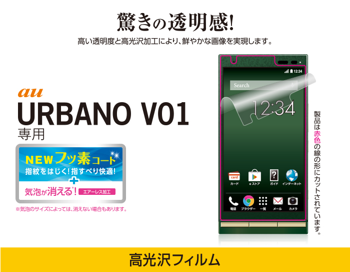 気泡がきれいに抜けるエアレスタイプ!au URBANO(V01)の液晶画面をキズや汚れから守る、光沢タイプの液晶保護フィルム。