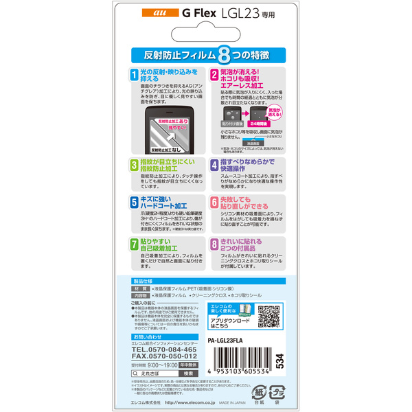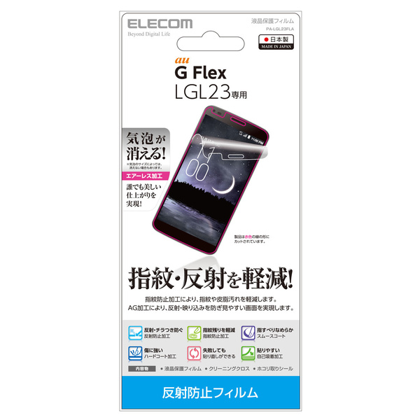 気泡がきれいに抜けるエアレスタイプ!au G Flex(LGL23)の液晶画面をキズや汚れから守り、スベスベした快適な操作を実現する、反射防止タイプの液晶保護フィルム。