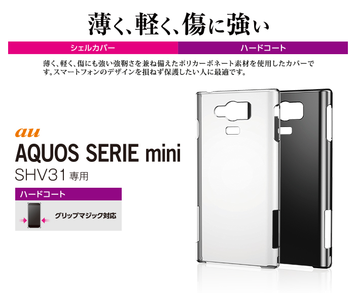 au AQUOS SERIE mini(SHV31)にぴったりフィットしてキズや汚れからしっかり守るポリカーボネート製のスリムなシェルカバーと保護フィルムです。
