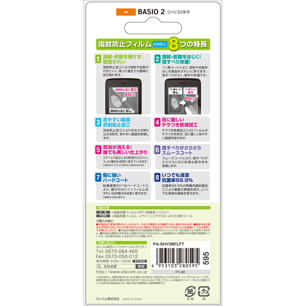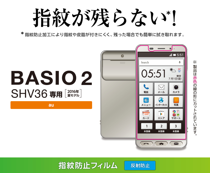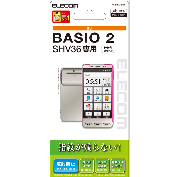 - au BASIO2の液晶画面をキズや汚れから守る、指紋防止タイプの液晶保護フィルムです。