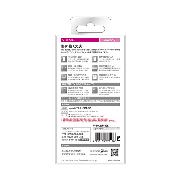 au Xperia(TM) UL(SOL22)をお好きなカラーにコーディネート!本体をキズや汚れから守る、ポリカーボネート製のスリムなシェルカバーと保護フィルム。