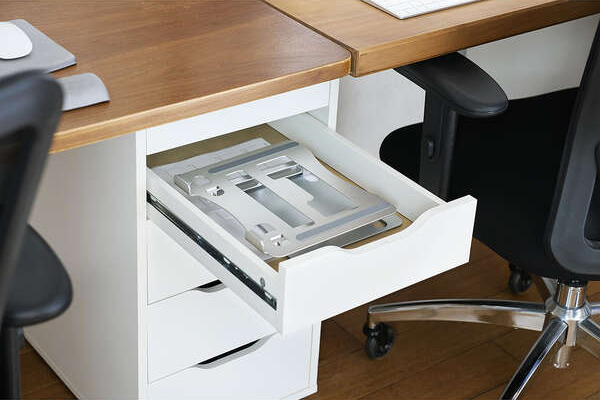 ノートパソコンスタンド下のスペースにキーボードを収納可能。スペースを有効活用できます。
