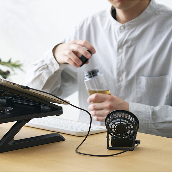 スタンドの中央付近に、ノートパソコンの過熱を防ぐ冷却ファンを搭載。冷やしたい場所に合わせて、上下に位置を調節可能です。