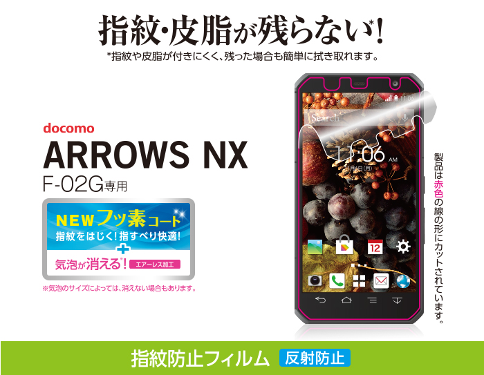 - docomo ARROWS NX(F-02G)の液晶画面をキズや汚れから守る、指紋防止タイプの液晶保護フィルムです。