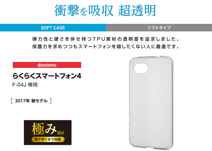 強じんな耐久性としなやかな弾力性を合わせ持ったTPU(熱可塑性ポリウレタン)素材を使用した、本体デザインが美しく際立つスーパークリスタルクリアのdocomo らくらくスマホ4(F-04J)用ソフトケースです。