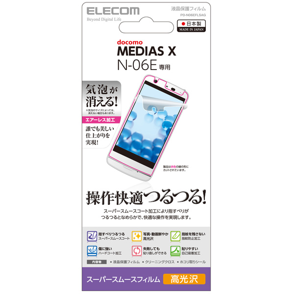 高光沢なのにツルツルとしたなめらかな指すべりを実現。高い透過率でdocomo MEDIAS X(N-06E)の液晶画面を美しく守り、なめらかな指すべりで快適に操作できるスーパースムースタイプの液晶保護フィルム!