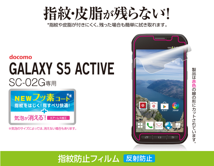 - docomo GALAXY S5 ACTIVE(SC-02G)の液晶画面をキズや汚れから守る、指紋防止タイプの液晶保護フィルムです。