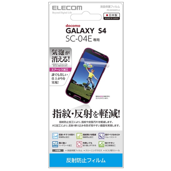 気泡がきれいに抜けるエアレスタイプ!docomo GALAXY S4(SC-04E)の液晶画面をキズや汚れから守り、スベスベした快適な操作を実現する、反射防止タイプの液晶保護フィルム。