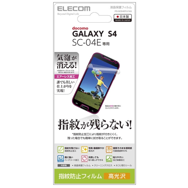気泡がキレイに抜けるエアレスタイプ。docomo GALAXY S4(SC-04E)の液晶画面をキズや汚れから守る、エアレスタイプの液晶保護フィルム。