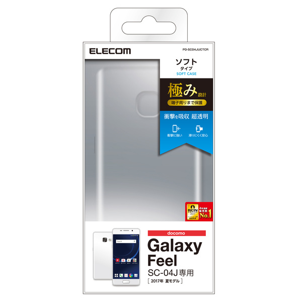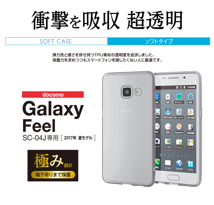 強じんな耐久性としなやかな弾力性を合わせ持ったTPU(熱可塑性ポリウレタン)素材を使用した、本体デザインが美しく際立つスーパークリスタルクリアの docomo Galaxy Feel(SC-04J)用ソフトケースです。