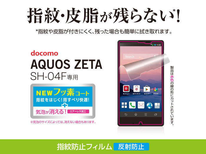 - docomo AQUOS ZETA (SH-04F)の液晶画面をキズや汚れから守る、エアレスタイプの液晶保護フィルムです。