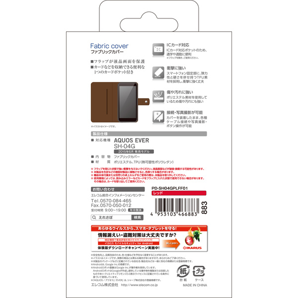 傷や汚れに強いポリエステル素材を使用したdocomo AQUOS EVER用ファブリックカバーです。内側のスマートフォン装着部分にはキズや汚れから守る、強じんでしなやかなTPU(熱可塑性ポリウレタン)素材を使用しています。