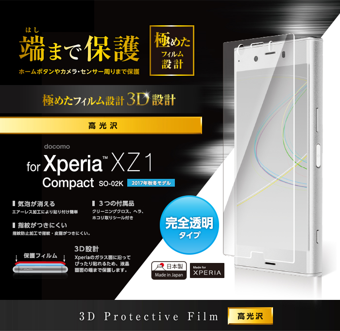 液晶画面を隅から隅まで保護できます。専用ヘラ付きで貼りつけやすく、液晶画面をしっかり守る高光沢タイプのXperia (TM) XZ1 Compact用液晶保護フィルムです。