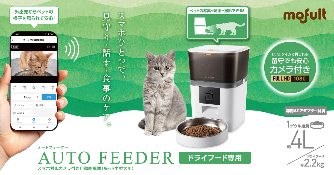 スマホアプリからリアルタイムで愛犬・愛猫の様子を確認できる、2段階の角度調節が可能なカメラ付き自動給餌器です。ごはんの量や回数を細かく設定でき、外出中でも規則正しい食生活をサポートします。