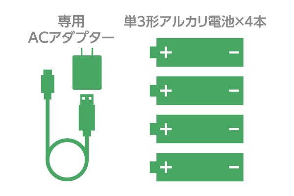 乾電池は非常用の予備電源となります。通常時は乾電池が入っていても、必ず付属の専用ACアダプターをご使用ください。また、乾電池で作動している場合、ネットワーク機能はご利用できません。