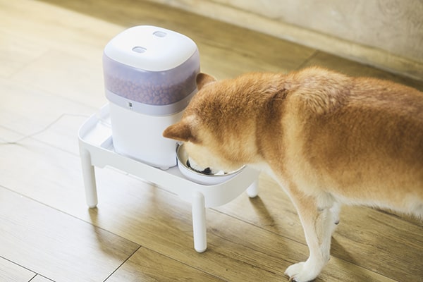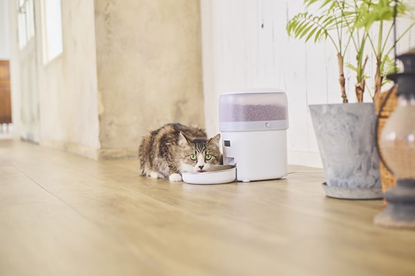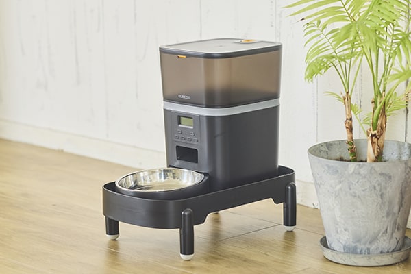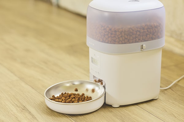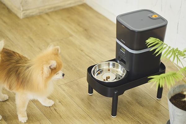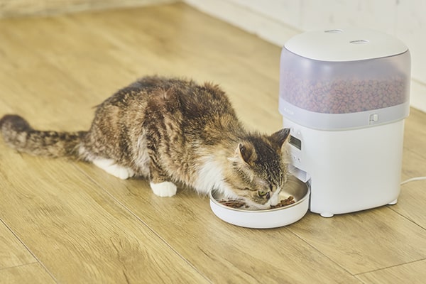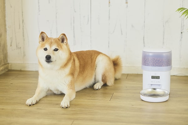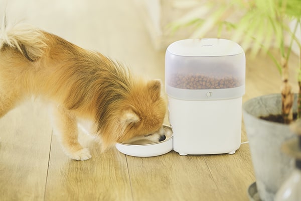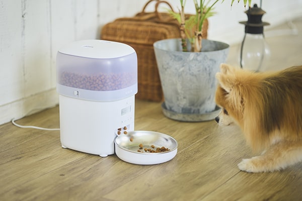 省スペース設計で、限られたスペースでも無理なく置ける。給餌のタイミングや量を細かく設定でき、外出中も規則正しい食生活でワンちゃん・ネコちゃんの健康維持をサポートする、タイマー式自動給餌器です。