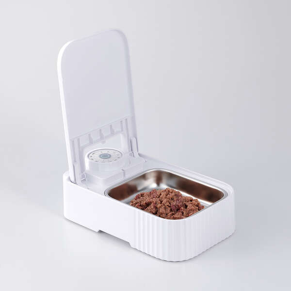 タイマーでセットした時間に蓋が開くことで、早朝や留守中にも給餌が可能。長時間の空腹を避けて肥満防止や吐き戻し防止に役立つ、ダイヤルタイマー式の自動給餌器です。