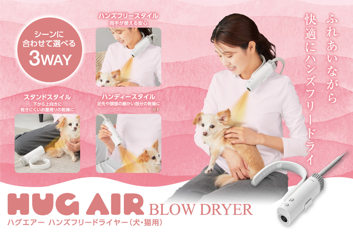 シャンプー後のドライをストレスフリーに!首や肩にかけられるフレキシブルホルダーで両手が自由に使え、ドライ時間がぐっと快適になるペット用ドライヤー「HUG AIR(ハグエアー)」です。愛犬・愛猫を抱きながら乾かせるハンズフリー、お腹周りを下から乾かせるスタンド、細かい部分に使えるハンディーと、シーンに合わせて選べる3WAYスタイル。安心感を与えつつ、効率的に乾かせます。