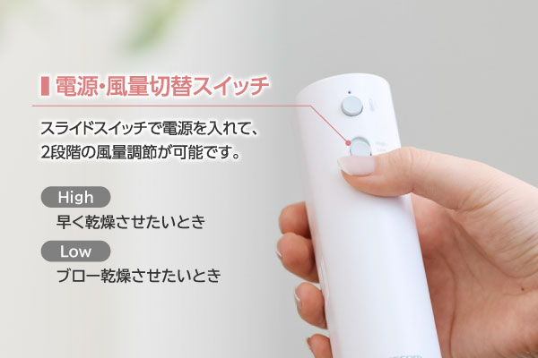 スライドスイッチで電源を入れ、2段階で風量調節が可能。ブラシレスモーターを搭載し、小さくてもパワフルな風で全身を乾かせます。