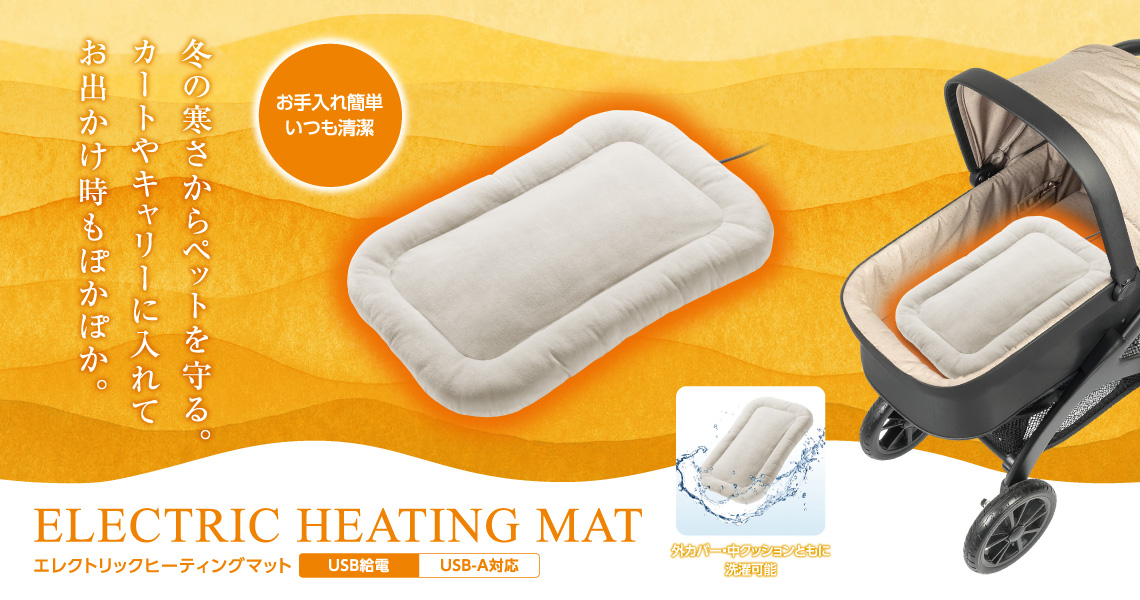 愛犬とのお出かけを温かく快適に。カートやキャリーに入れて冬の寒さから愛犬を守るUSB給電式のヒーティングマットです。モバイルバッテリー対応で外出先でも使えます。外カバー・中クッションともに手洗いできるので、清潔を保ちながら繰り返し使えます。