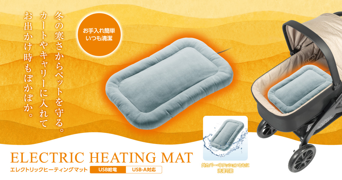 愛犬とのお出かけを温かく快適に。カートやキャリーに入れて冬の寒さから愛犬を守るUSB給電式のヒーティングマットです。モバイルバッテリー対応で外出先でも使えます。外カバー・中クッションともに手洗いできるので、清潔を保ちながら繰り返し使えます。