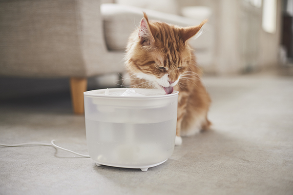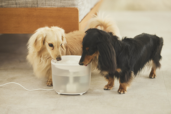 トレイ中央からポコポコと水が湧き出る湧水タイプです。 穏やかな水流でひげに水が当たりにくく、360度どこからでも飲める広い飲み口で多頭飼いにも対応しています。