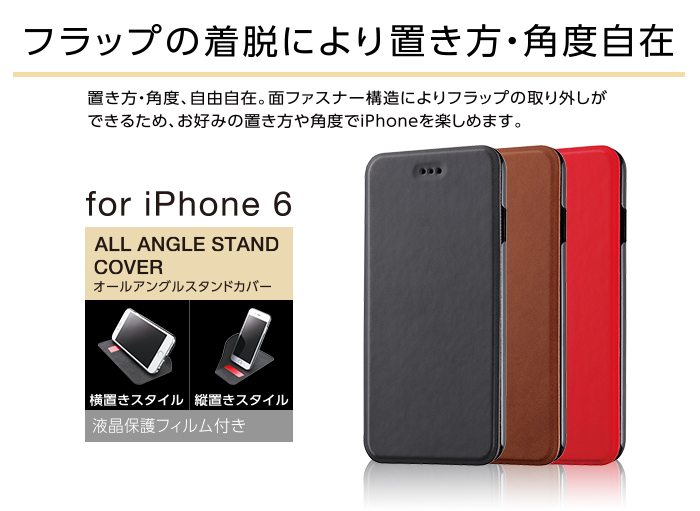 面ファスナー付きのカバーと液晶画面部分を保護するソフトレザー素材のフラップを組み合わせ、置き方・角度が自由自在にできるiPhone 6用オールアングルスタンドカバーです。フラップにはキズや汚れに強いソフトレザー素材を使用しています。また、ソフトレザーの上質な質感が手に心地よくなじみます。