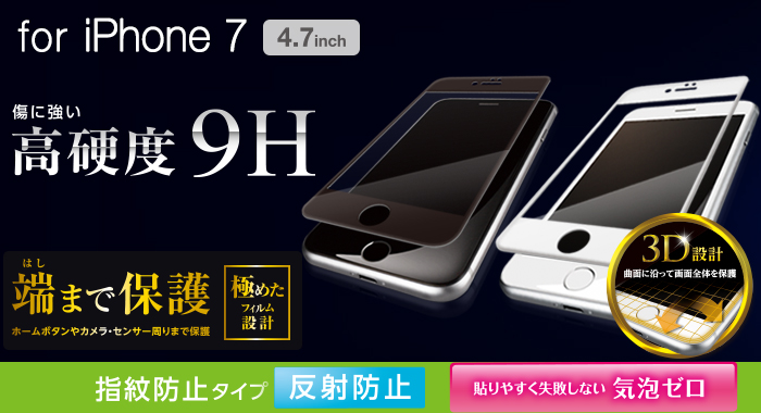 高硬度9Hで傷に強い。 画面の端まで保護するフルカバータイプのiPhone 7用気泡ゼロフィルム。