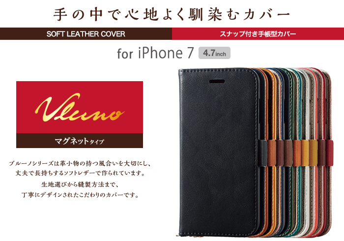 革小物のような風合いを楽しめる。しっかりとフラップを固定できるマグネットフラップを採用したiPhone 7用ソフトレザーカバーです。