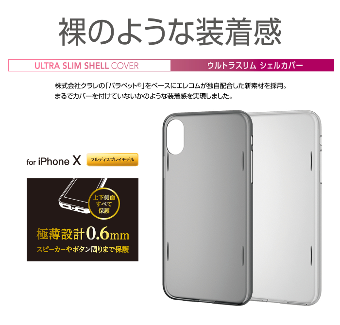 極めたカバー設計と極薄0.6mmで、カバーを付けていないかのような装着感を実現したiPhone X用ウルトラスリムシェルカバーです。※最薄部
