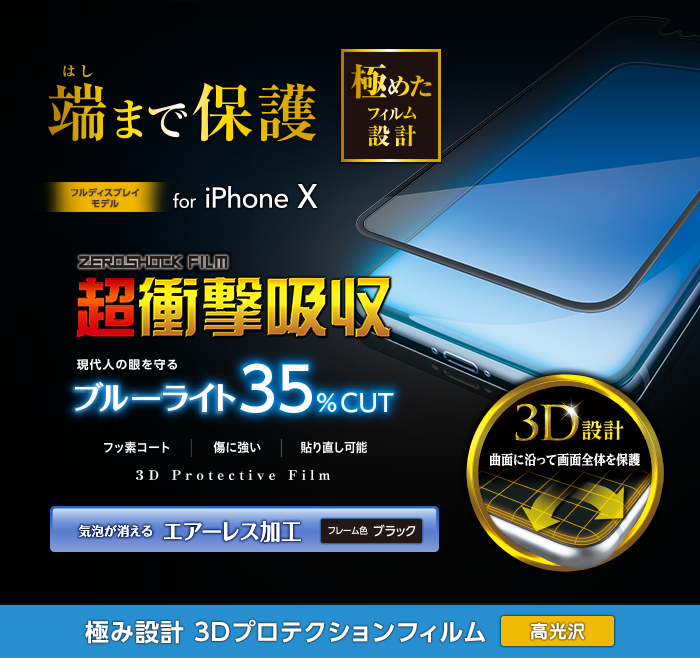 iPhone X用のラウンドした液晶画面の縁まで貼れる、衝撃吸収・ブルーライトカットタイプの高光沢フィルムです。