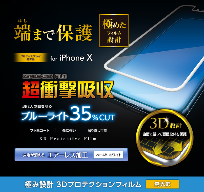 - 端末のラウンド部分にも特殊粘着層を採用し、液晶画面を端まで保護。iPhone X用高光沢タイプの液晶保護フィルムです。