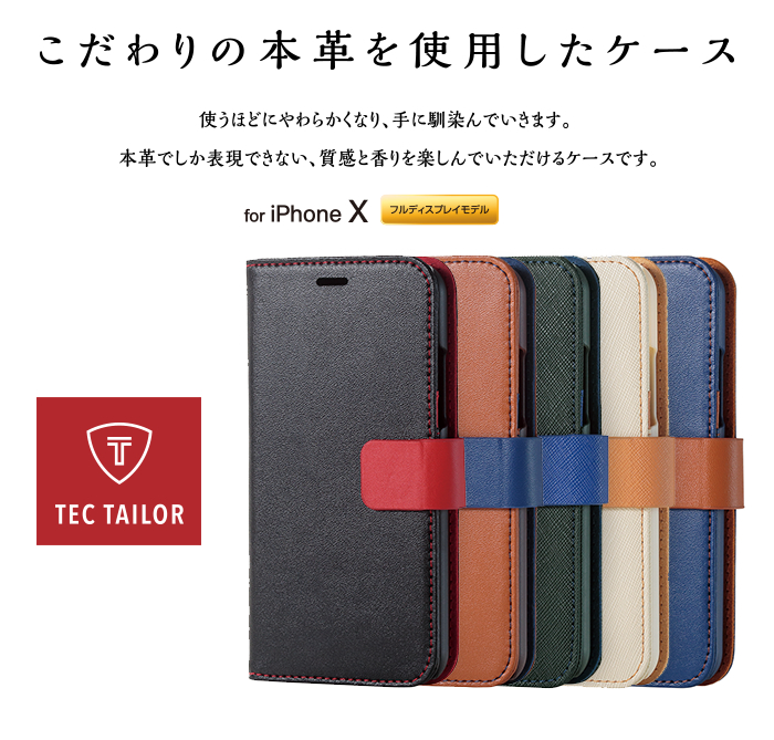質感と香りを楽しめる、こだわりの本革“TEC TAILOR”を使用。 アクセントとなるマグネットベルト付きで、使うほどにやわらかくなり手に馴染むiPhone X用レザーカバー/スプリットレザー/Tec teilor/ベルト付。