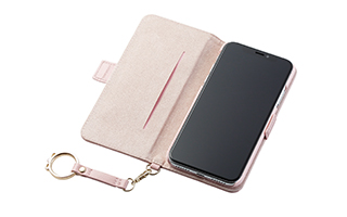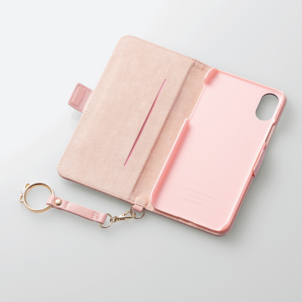 カバー本体と、付属するフィンガーストラップにもリボンが付いたiPhone X用ソフトレザーカバーです。