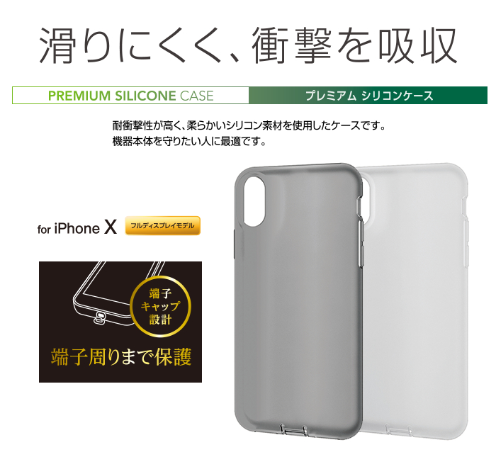 耐衝撃性が高く、柔らかいシリコン素材を使用し、端子まで保護ができる設計を採用したiPhone X用シリコンケースです。