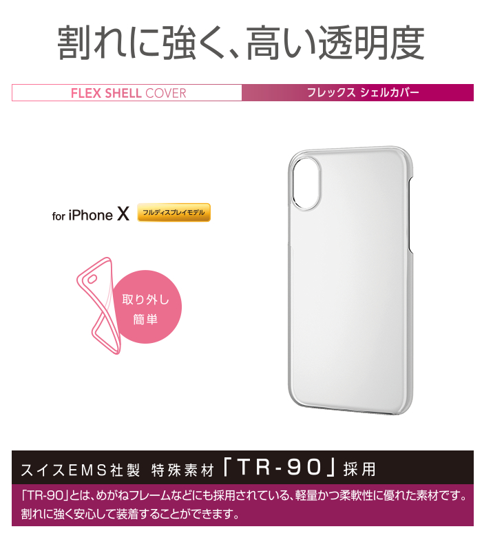 割れに強い新素材「TR-90」を採用!薄型・軽量設計でありながらしなやかな強さを実現したiPhone X用フレックスシェルカバーです。