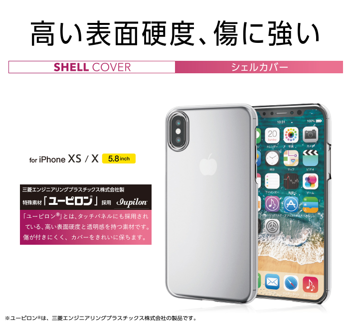 新素材「ユーピロン(R)」を使用し、高い表面硬度(8H)と透明性を実現したiPhone XS、iPhone X用エクストラハードシェルカバーです。