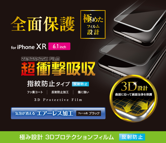 • 端末のラウンド部分にも特殊粘着層を採用し、液晶画面を端まで保護。iPhone XR用反射防止タイプの液晶保護フィルムです。