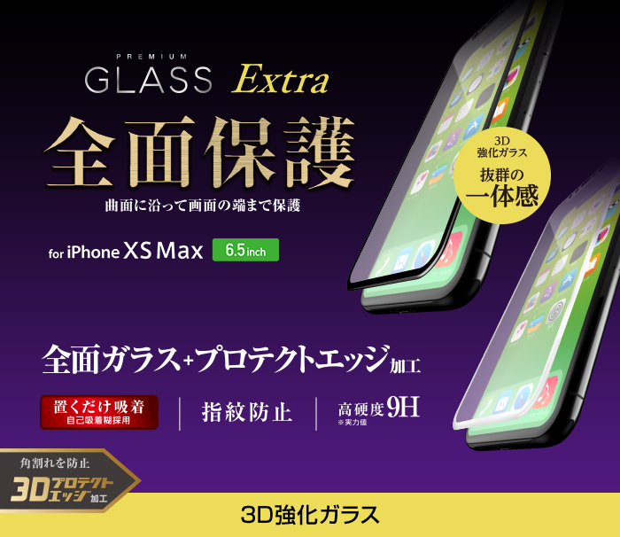 • 3Dプロテクトエッジ加工を施したハイブリッドフレーム付きで角割れを防止するフルカバータイプのiPhone XS Max用ガラスフィルムです。