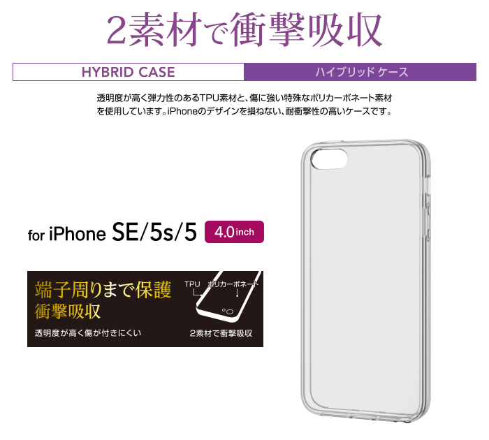 側面に弾力性のあるTPU素材を、背面に強じんで透明度の高いポリカーボネート素材を使用した、スリムなスタイルのiPhone SE / 5s /5用ハイブリッドケースです。