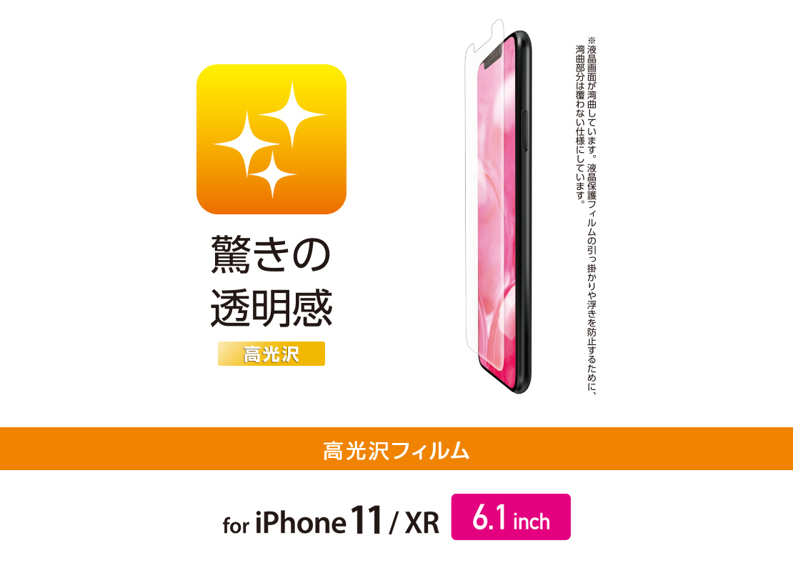 iPhone 11、iPhone XRの液晶画面をキズや汚れから守る、高光沢タイプの液晶保護フィルムです。