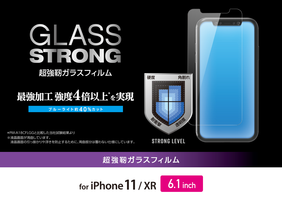 • 超強靱加工により角割れにも強く、最強加工 強度4倍以上を実現したブルーライトカットタイプのiPhone 11、iPhone XR用ガラスフィルムです。