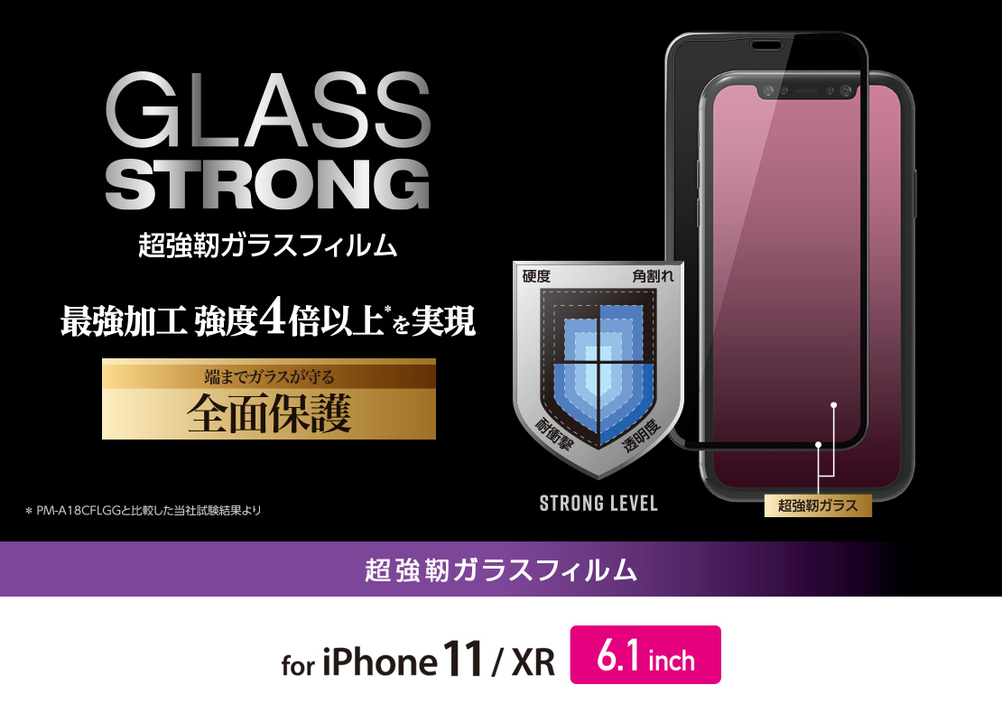 最強加工 強度4倍以上を実現。※PM-A18CFLGGと比較した当社試験結果より。 超強靱加工により、角割れに強いエッジ部分と最強クラスの耐衝撃性を実現した、3D構造ガラスによる全面保護タイプのiPhone 11用ガラスフィルム。
