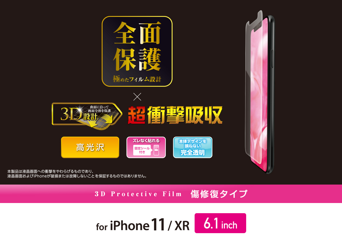• 端末のガラス面と同じラウンド形状を再現した3D設計で、画面の端まで保護する傷リペアタイプのiPhone 11、iPhone XR用フルカバーフィルムです。