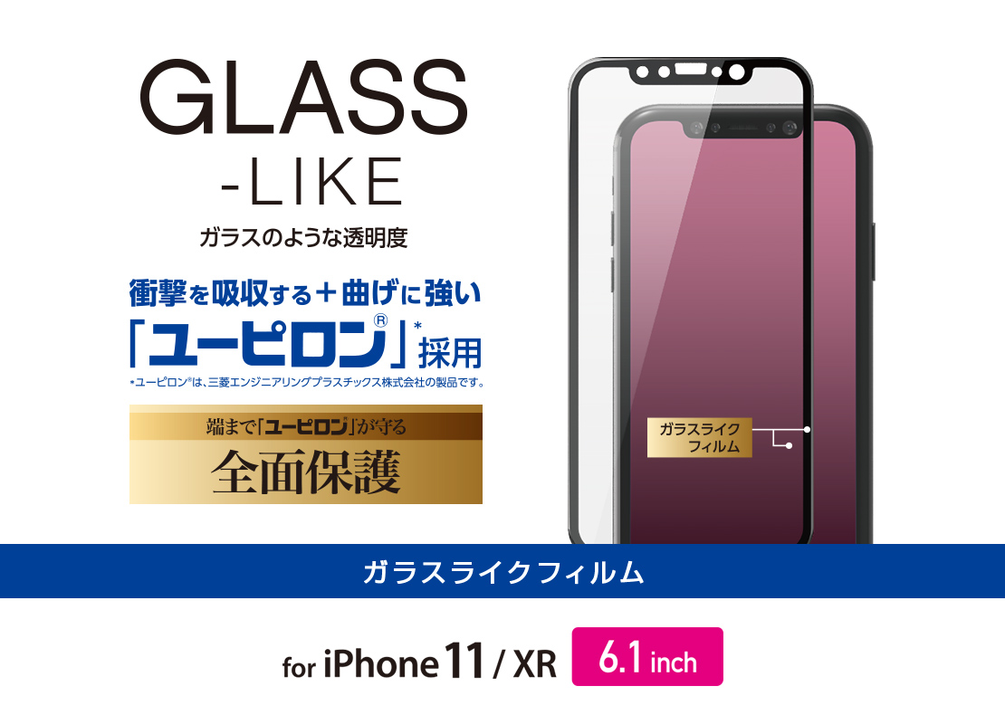 液晶画面を隅から隅まで保護できる!曲げに強い新素材「ユーピロン(R)」を採用。ガラスのように美しい透明感と、抜群の耐衝撃性をもった「ユーピロン(R)」を採用したiPhone 11、iPhone XR用フィルムです。