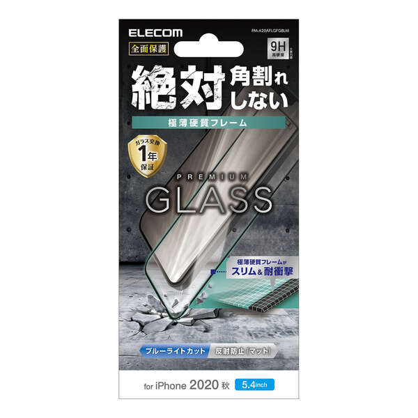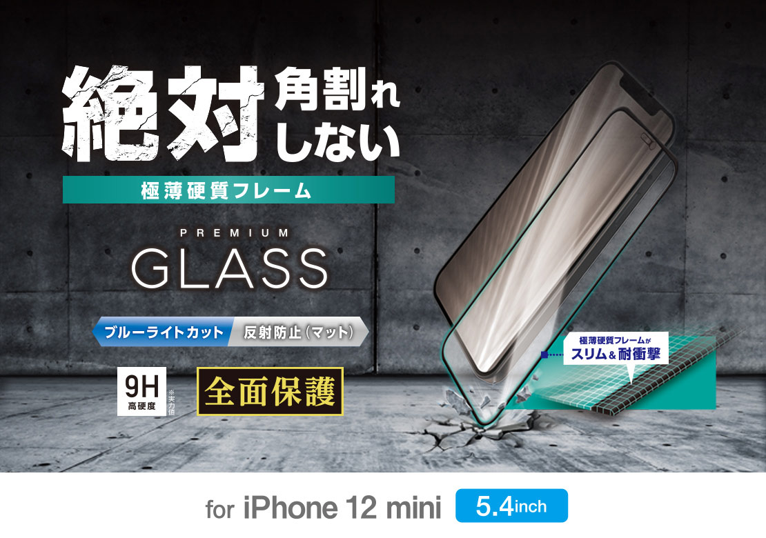• 極薄硬質フレームが角からの衝撃を吸収する、ブルーライトカット、反射防止タイプのiPhone 12 mini用フレーム付き液晶保護ガラスです。