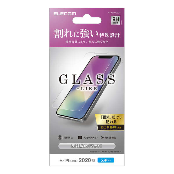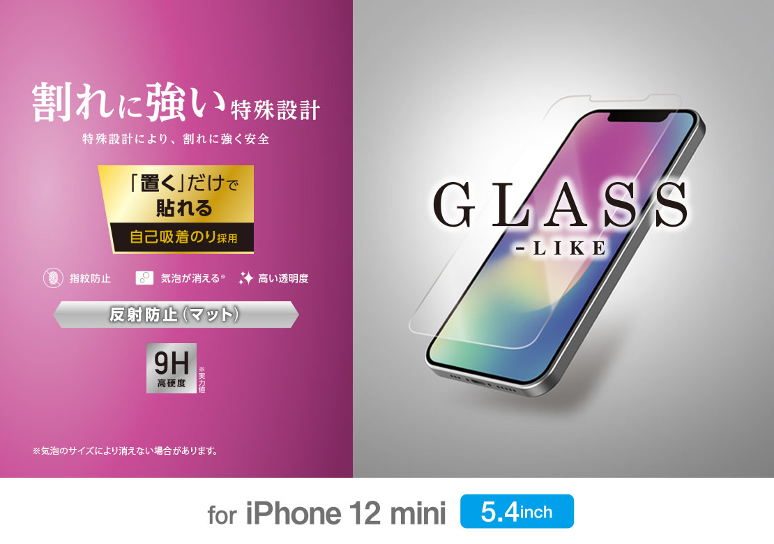 • ガラスのように美しい透明感を実現!割れに強く、ガラスと同じ高硬度9Hを実現した反射防止タイプのiPhone 12 mini用液晶保護フィルムです。